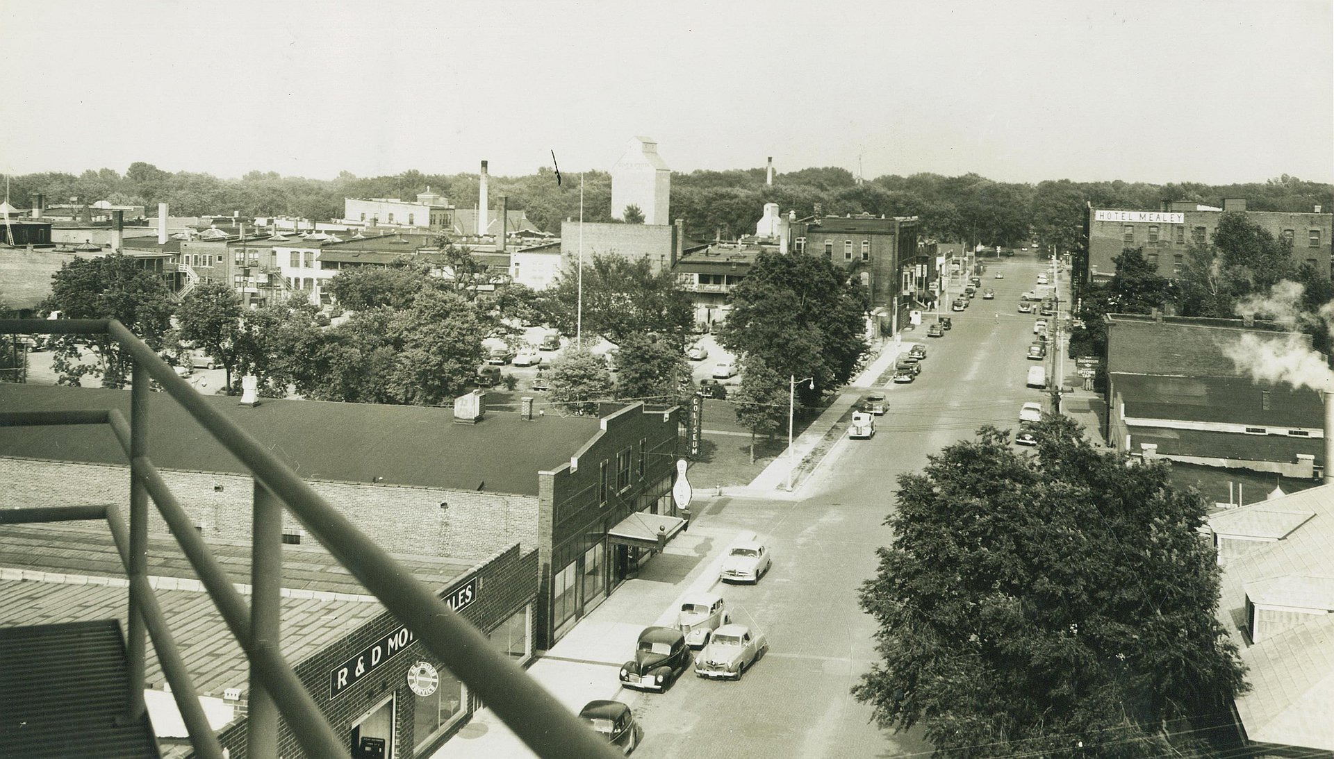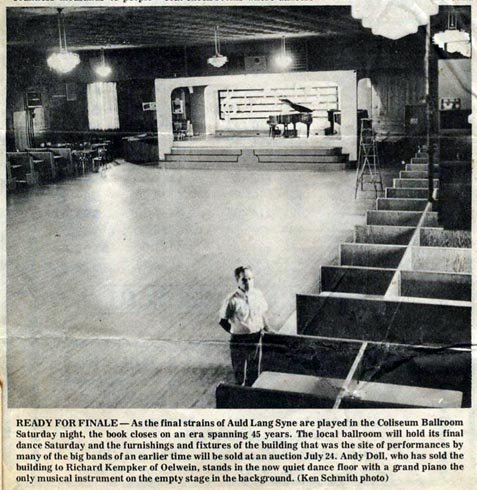 The Coliseum Ballroom in Oelwein, Iowa opened its doors for the first time in 1928 with Paul Remaine of New York providing the music for a capacity crowd. Vern Sissel purchased the business in the mid 30’s and brought in big name bands. In its heyday, the Coliseum Ballroom used to feature numerous big bands (Sammy Kaye, Dorsey Brothers, Les Brown, Guy Lombardo, Lawrence Welk, Glenn Miller, Tex Ritter, Big Tiny Little, Don Glasser Orchestra, Bobby Hankins Show, Jan Garber Orchestra, Floyd Warren Show, Tony Hill, Bob and Bobby Thomas of the WGN TV Barn Dance and many others) throughout the 30’s, 40’s, and 50’s. In the 60’s and 70’s, rock bands were the standard attraction at the Coliseum. Andy Doll owned and operated the Coliseum from 1963-1973. He bought the Coliseum in 1963 from Vern and Edna Luther. Ray Stoddard, retired Oelwein police chief, recalled the admission to Lawrence Welk on a Saturday night was 50 cents per couple. He also remembered Sammy Kaye’s appearance in 1945 or 1946. Kaye drew 4,100 paid admissions at $2.50 per person. When Orrin Tucker appeared there with Wee Bonnie Baker, those who could not squeeze into the ballroom danced on the street to music from speakers set up outside. Over many decades countless thousands of people passed through the main entrance double doors, past the ticket booth and coat check rooms to the main bar. A double line of wooden booths lined the walls from the entry to the stage. A balcony sat atop the entrance to the dance floor area; filled with booths for sitting and watching. The balcony also had a bar with food offered such as hamburgers and pizza. Heavy curtains blocked the tall windows so the only light in the ballroom came from globe type lights suspended from the picturesque dull red metal ceiling. After the big band era waned, the newest owner Andy Doll gave teen dances a try. Rock and roll music filled the air in the ballroom. By that time other parts of the Coliseum building had closed. The second story apartment was unoccupied and the six-lane bowling alley in the basement shut down permanently in the 60s. Doll purchased the ballroom in December of 1962. Doll was a musician and in that same year had the hit record “Wild Desire” on the national charts. He won the second best country western dance band award in the from the National Ballroom Operators Association, behind the legendary Hank Thompson. The era of the Coliseum ended on July 14, 1973 when the ballroom held its final dance with music by Dave Dighton, one of the top bands in the area. Doll the Coliseum’s famous grand piano for the final number at the final dance. On Tuesday, July 24, 1973, the contents of the entire building, from the bowling balls to the drinking glasses were sold at a public auction billed as a “wall to wall” quitting business sale. The Coliseum was one of Iowa’s Grand Old Ballrooms that is sadly now but a memory. The Coliseum was once one of many ballrooms in Iowa. Today very few remain active. The Coliseum Ballroom was inducted into the Iowa Rock and Roll Hall of Fame in 2011.
