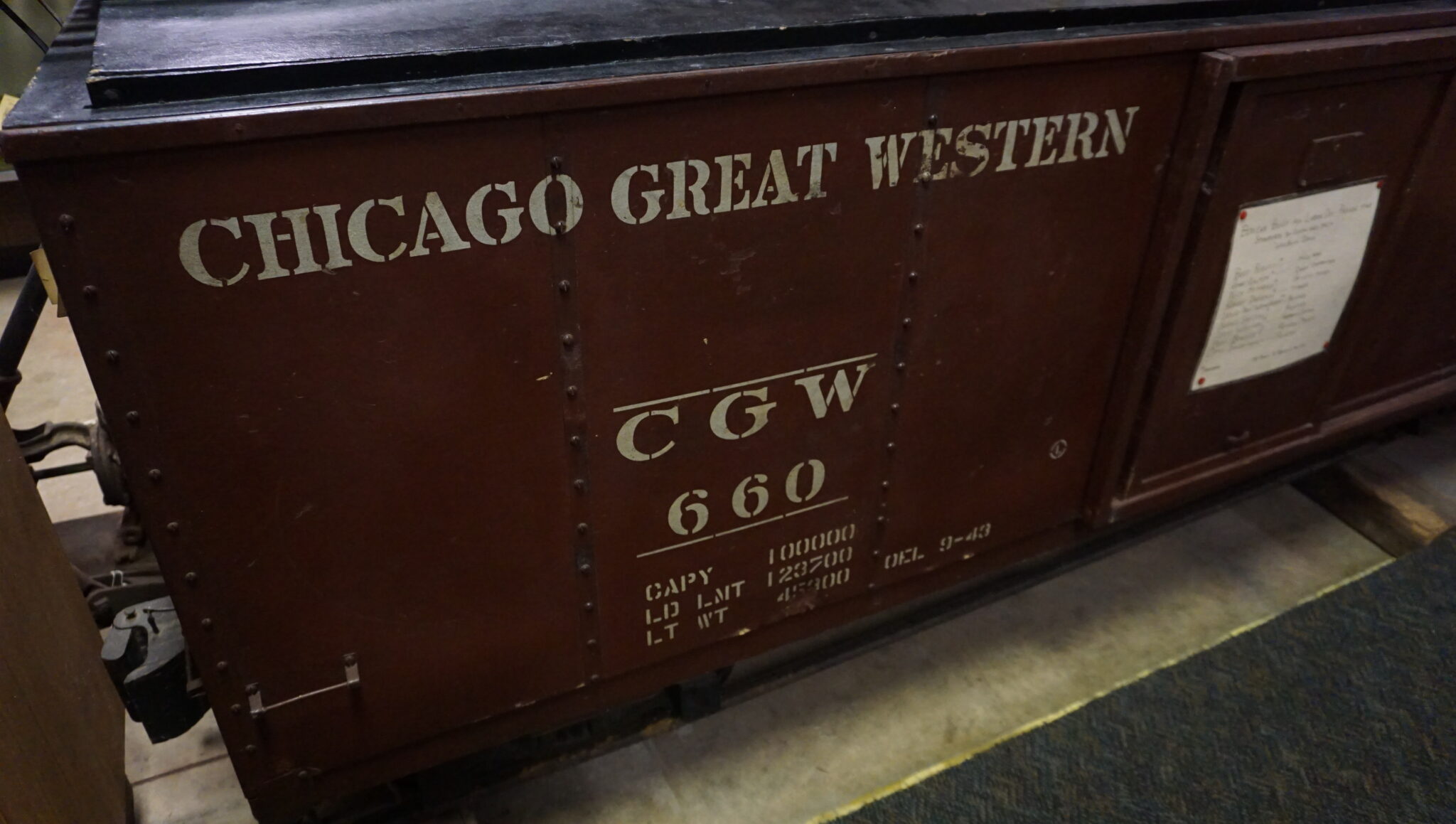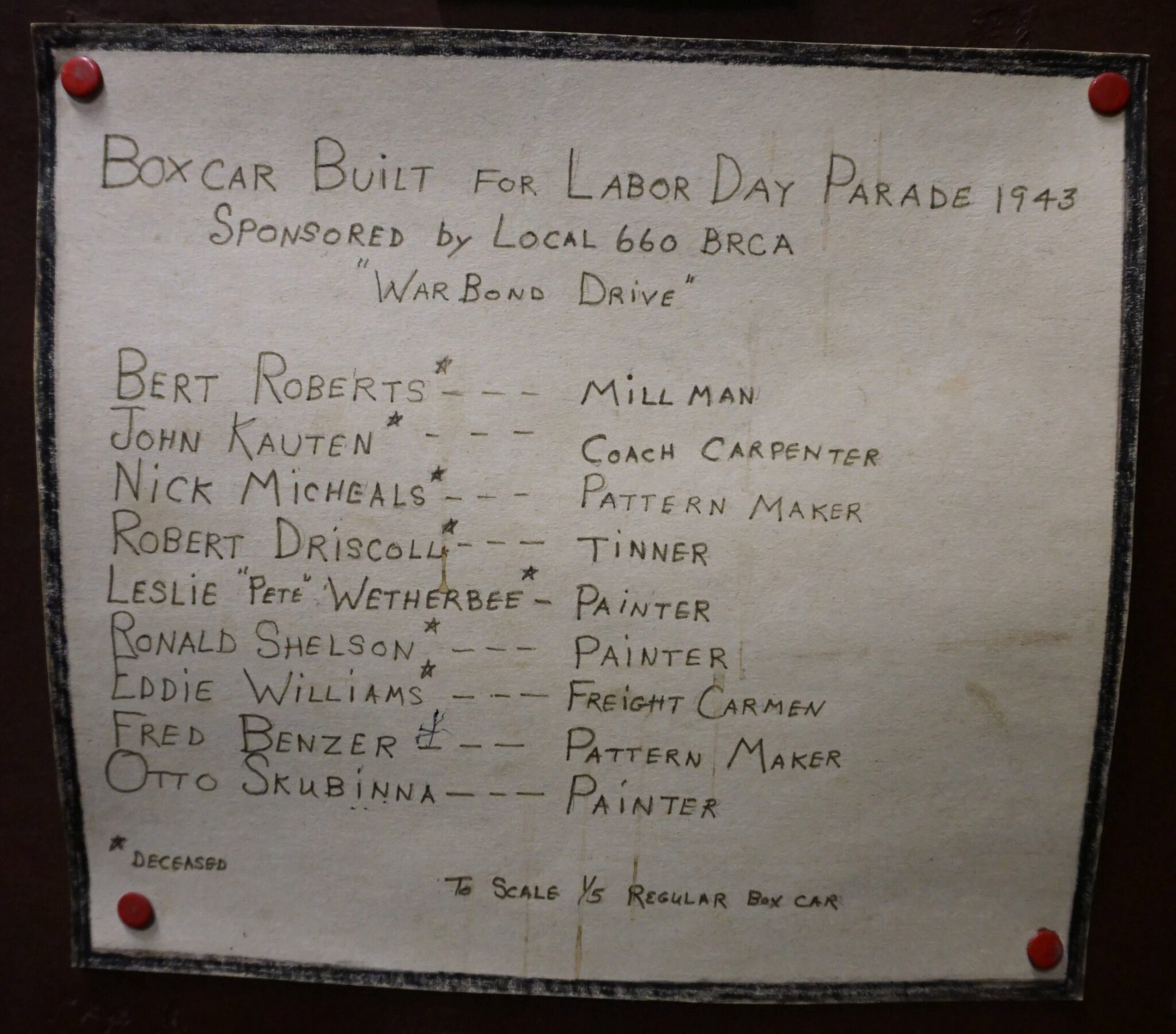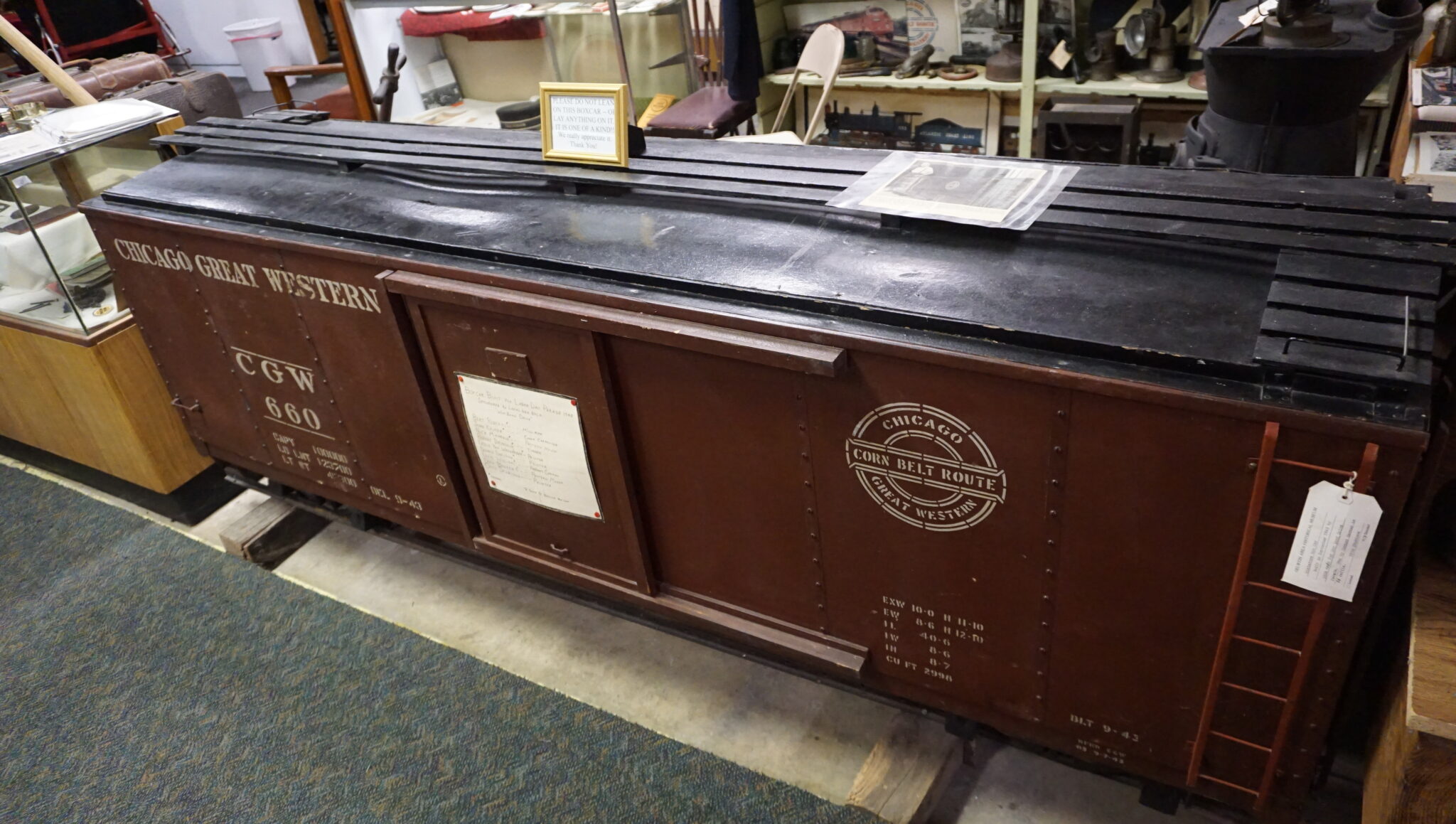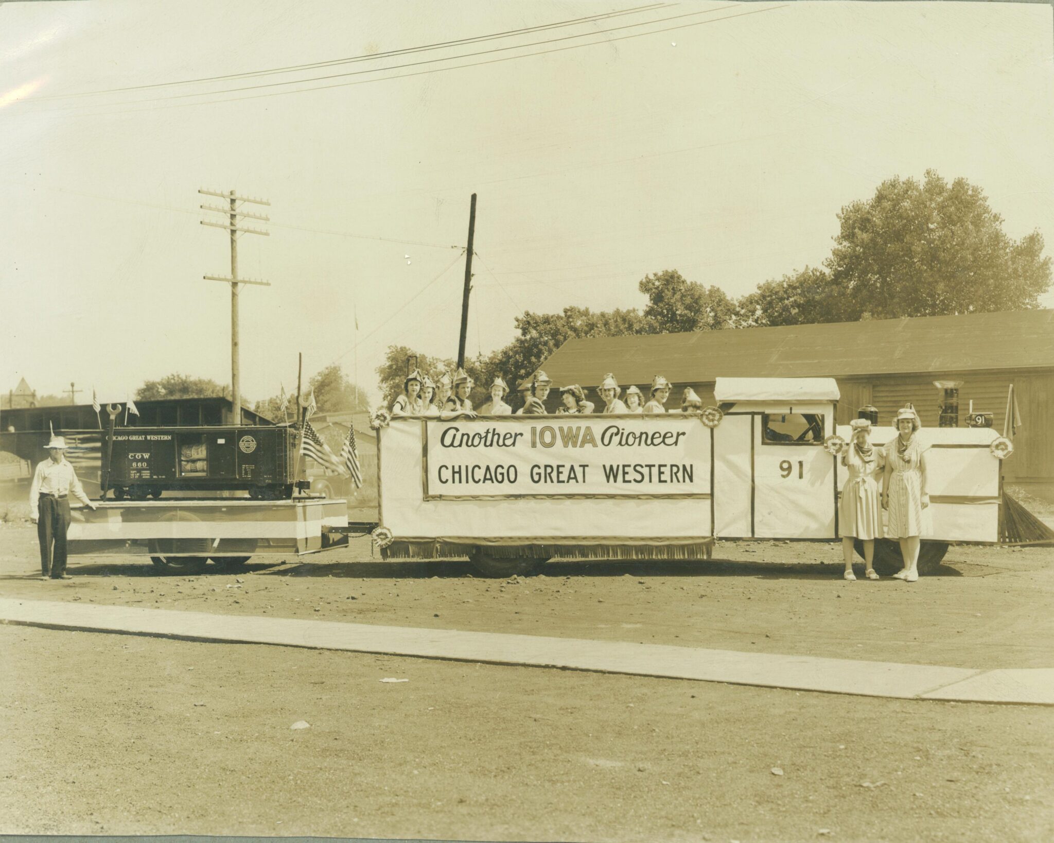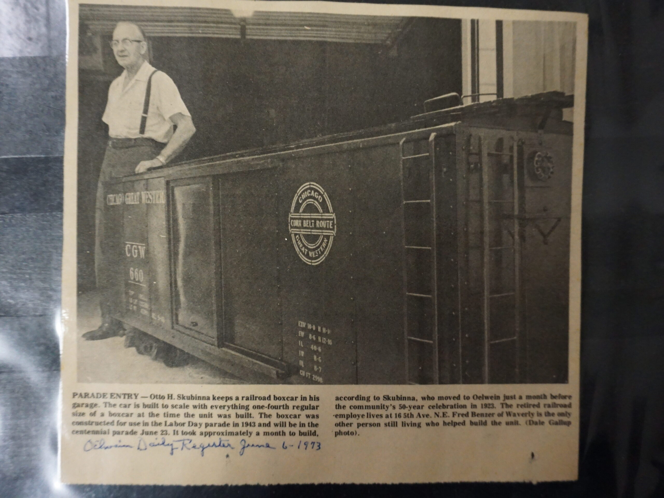 This was a boxcar that was made as a float for the Labor Day Parade in 1943 to promote war bonds and to celebrate the local railroad heritage in Oelwein.